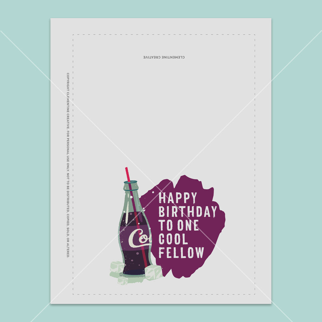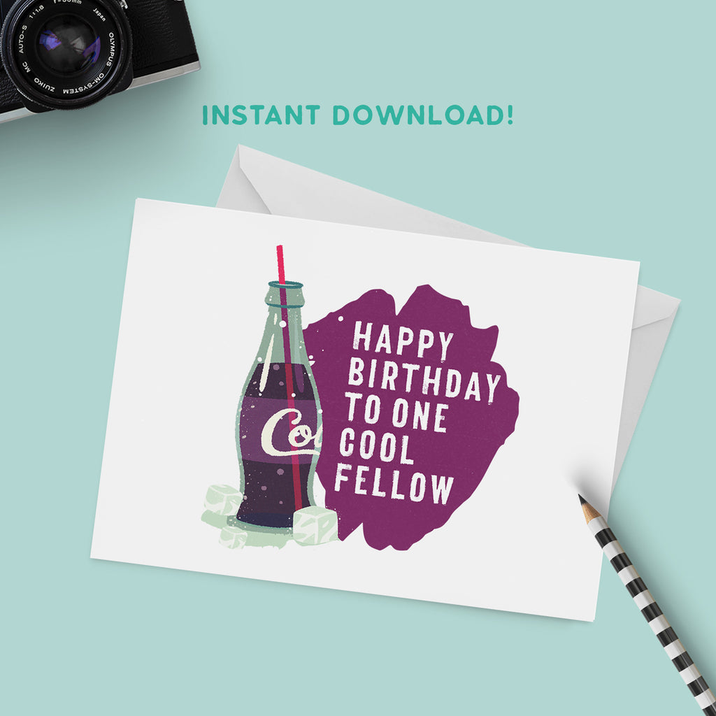 Looking for a cool greeting card for the men in your life? Look no further. This printable birthday card featuring a soda bottle illustration and the words, "happy birthday to one cool fellow" is perfect for your cool guy friend, dad, father-in-law, or husband.