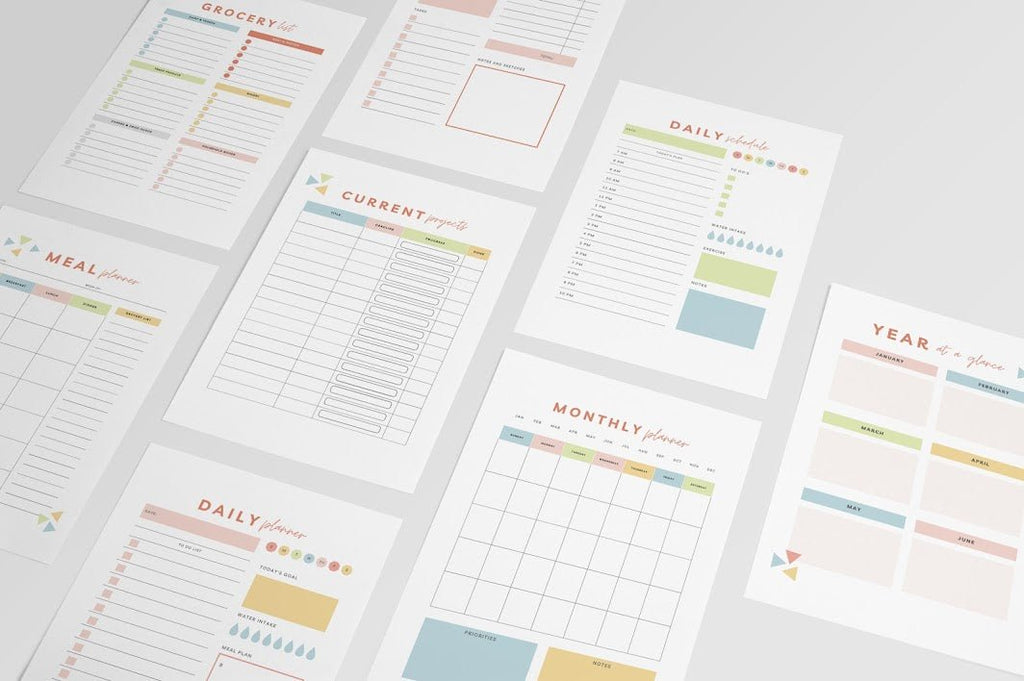 - Meal planner, grocery list, cleaning schedule, recipe card