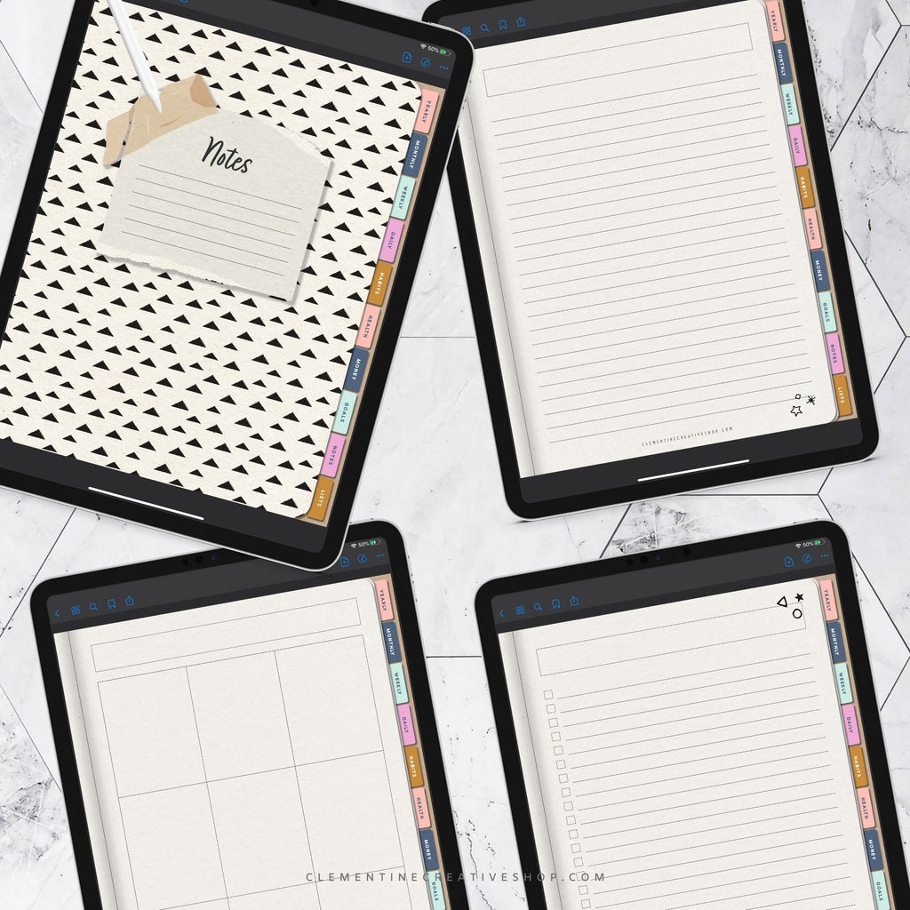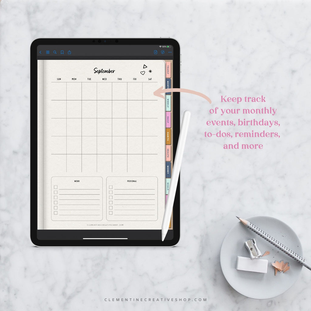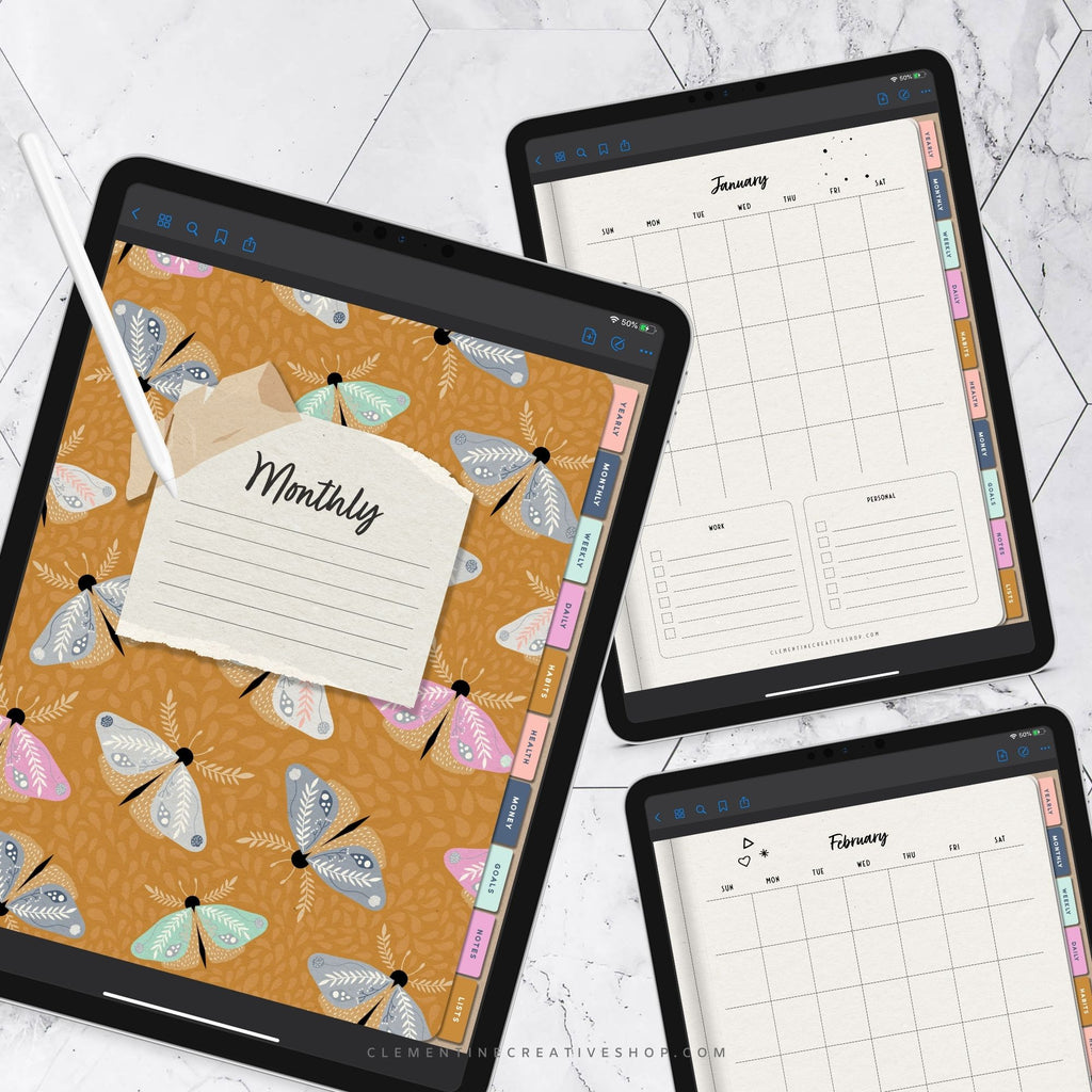 A digital planner is a PDF with hyperlinked tabs that is to be used on an iPad or tablet. You can write directly on the planner with a stylus like Apple Pencil. You can also tap on the tabs on the right side to instantly flip to that location instead of flipping through by hand. This planner works in apps like Goodnotes, Noteshelf, Xodo or Notability.
