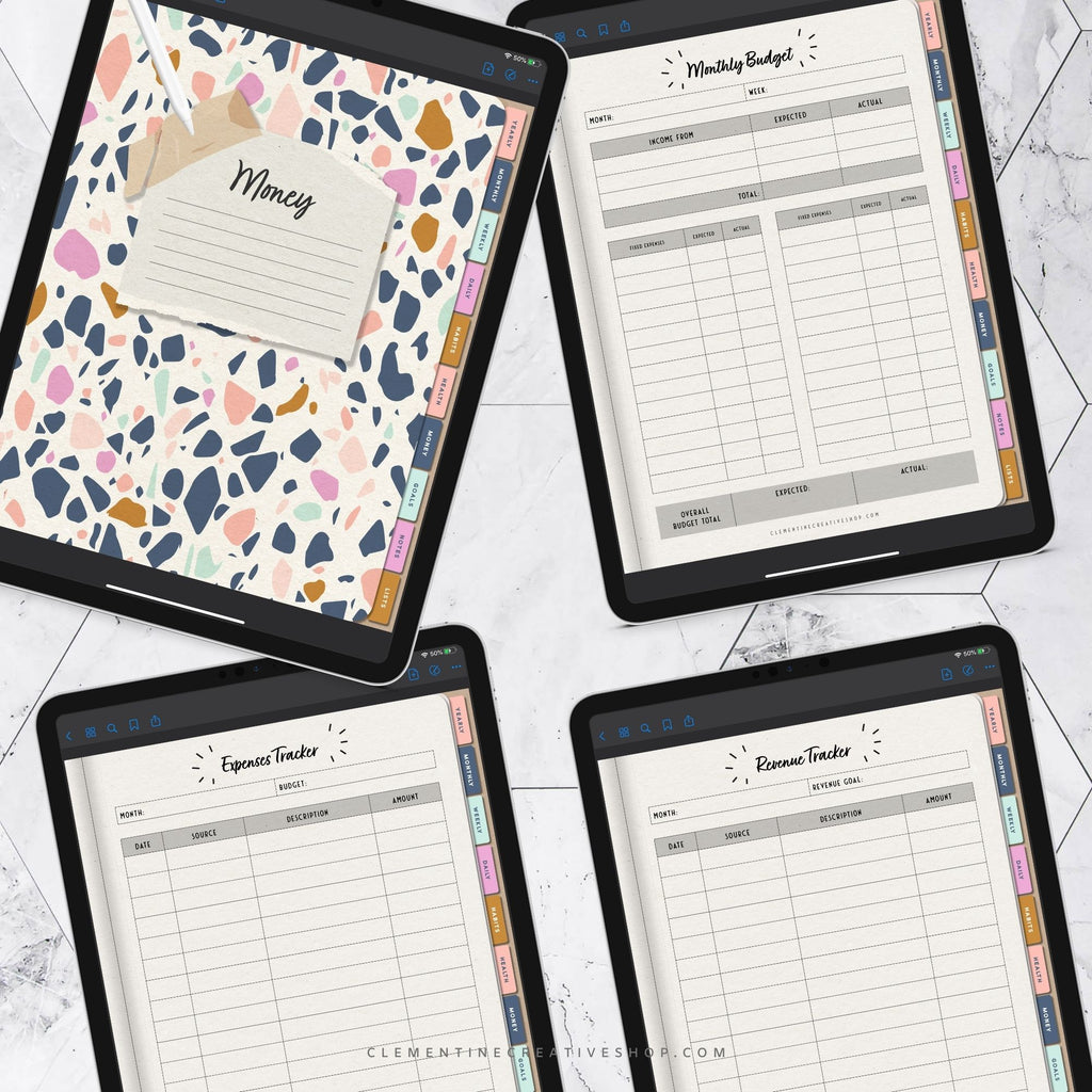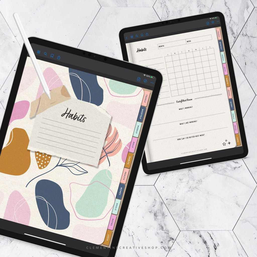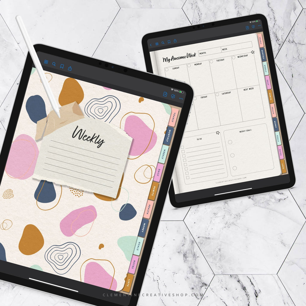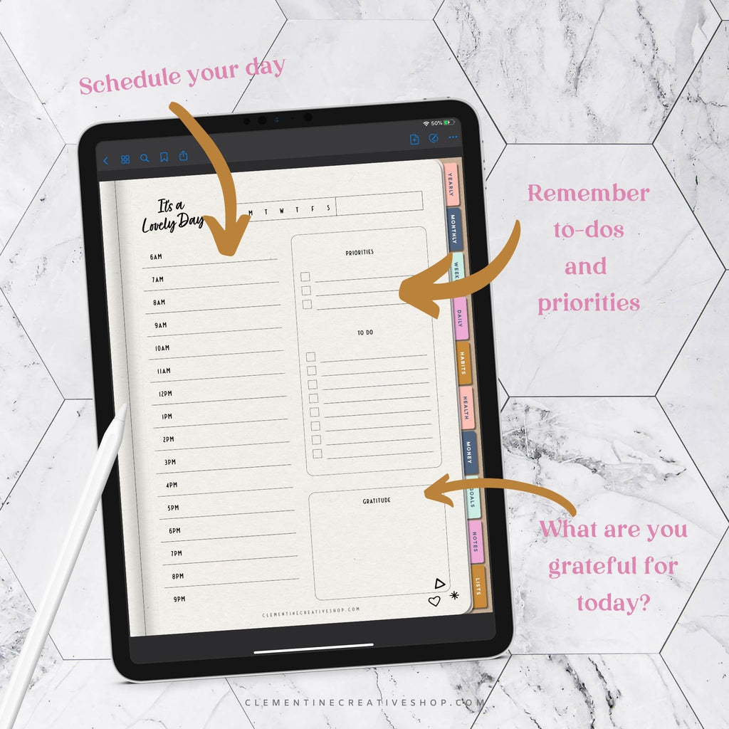 A digital planner is a PDF with hyperlinked tabs that is to be used on an iPad or tablet. You can write directly on the planner with a stylus like Apple Pencil. You can also tap on the tabs on the right side to instantly flip to that location instead of flipping through by hand. This planner works in apps like Goodnotes, Noteshelf, Xodo or Notability.
