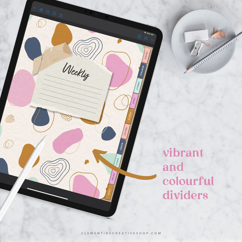 This digital planner features vibrant divider pages and simple planning pages so that you can add your own decorations.