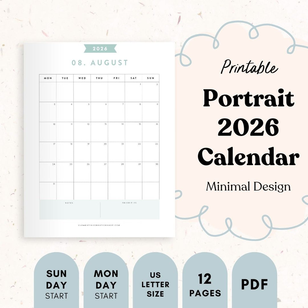PORTRAIT 2026 Printable Calendar | Simple Calendar PDF Download